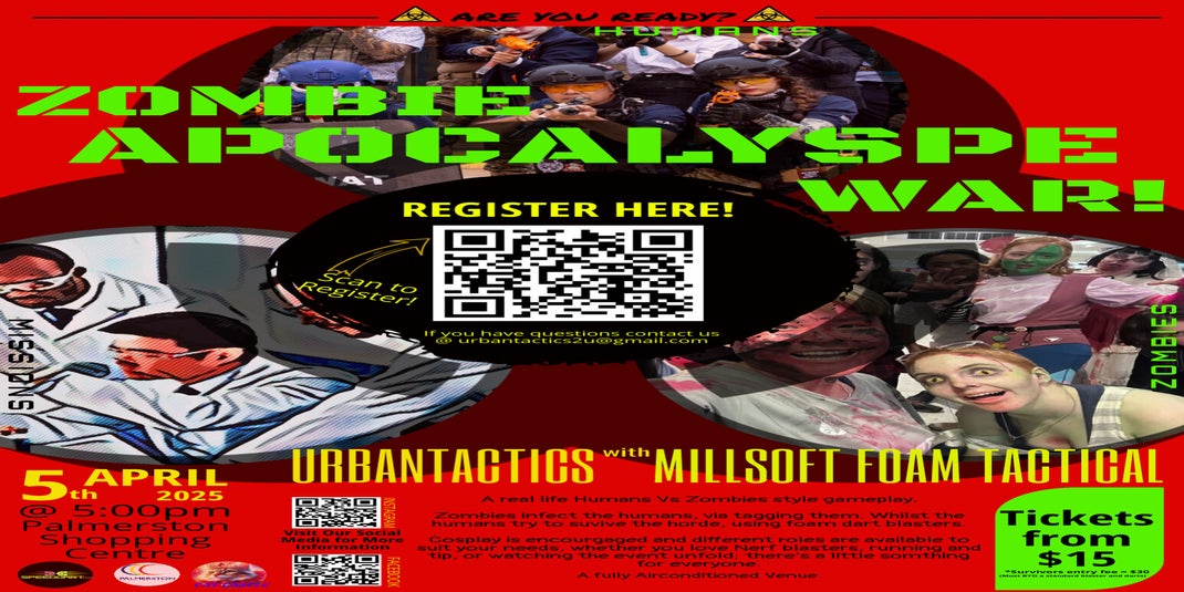 The event features a foam dart blaster war between humans and 'zombies', in a battle held at an Abandoned (After Hours) Palmerston Shopping Centre. An evening dedicated to the infected world, whether you're the last team standing trying to defend humanity, or a zombie trying to infect the final survivors. Or rather simply want to watch the chaos unfold, there's a little something for everyone to enjoy. Cosplay is highly encouraged, with prizes available for the best dressed individual and best team costumes.